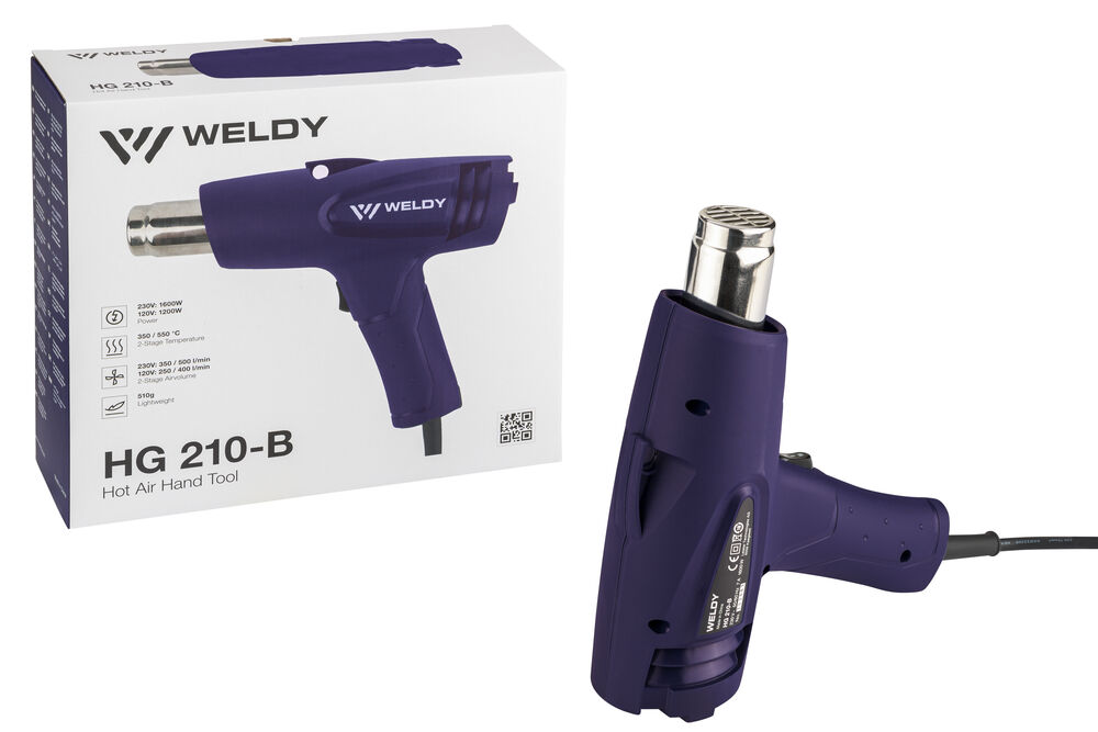 The lightweight, 510 g / 1.12 lbs. Weldy HG 210-B heat gun is an excellent entry-level tool for hot air applications, including paint and floor tile removal, thawing frozen pipes and loosening rusted bolts. This 1600W heat gun is suitable for countless DIY tasks. Weldy’s ideal, multi-purpose heat gun is suitable for most hot air applications.